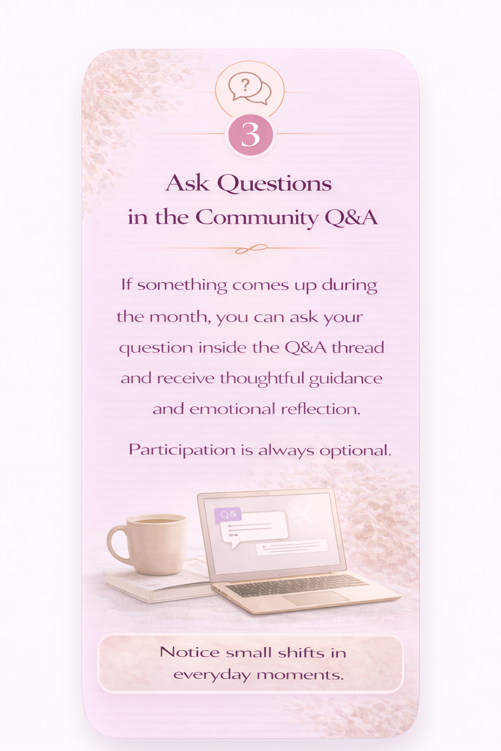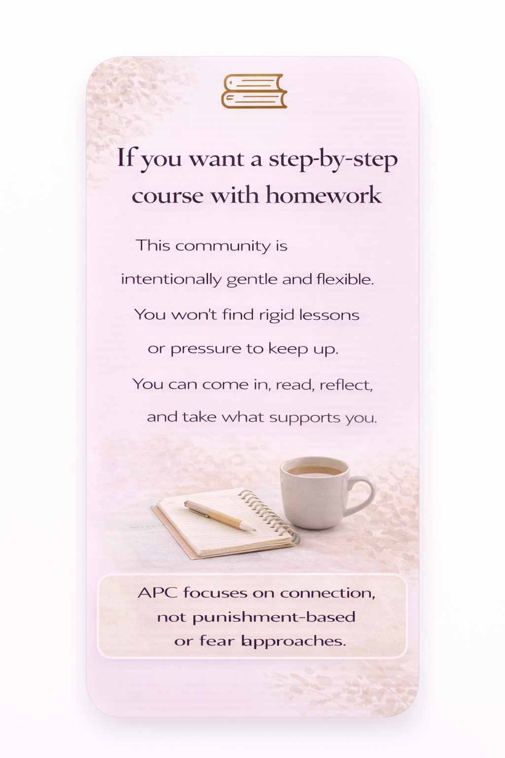 There is no pressure to keep up. Come in, take what supports you and grow at your own pace.